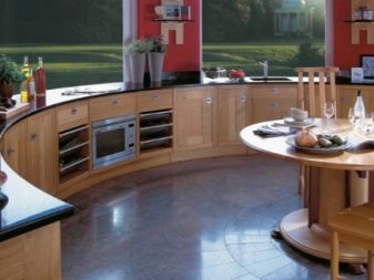أثاث المطبخ غير القياسي يبدو دائمًا أنيقًا وجذابًا. بالنسبة لمنزل ريفي صيفي أو منزل ريفي به غرفة مستديرة ونوافذ بانورامية ، فإن المطبخ الخشبي الموجود في نصف دائرة سيكون حلاً ممتازًا. سطح عمل كبير والعديد من الأدراج في الطبقة السفلية يعوضون عن نقص خزائن الحائط ويحافظون على الشعور بالتهوية. طاولة خشبية مستديرة على ساق واحدة وكراسي عالية الظهر ستدعم المفهوم العام للمطبخ. حل رائع آخر للإقامة الصيفية هو أثاث المطبخ بأناقة "بروفانس", السماء الزرقاء. ستكمل خزانة الأدراج الكبيرة مجموعة المطبخ وستستوعب عددًا كبيرًا من الأشياء الصغيرة المختلفة. من الأفضل وضع طاولة طعام ضخمة في وسط المطبخ ، مما سيخلق جوًا لطيفًا من الراحة عندما يجتمع جميع أفراد الأسرة..
