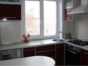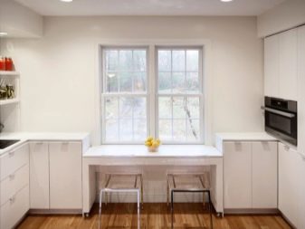 سيساعد توفير المساحة بشكل صحيح في مطبخ صغير على استخدام المساحة الموجودة أسفل عتبة النافذة لوضع منطقة تناول الطعام أو سطح العمل. من المهم شراء الملحقات الضرورية التي من الأفضل عدم الادخار عليها. بالنسبة للخزانات ، يجب أن تكون المفصلات والخزانات ذات نوعية جيدة. يمكن قطع صفائح DPS أو MDF إلى الحجم المطلوب في أي سوق إنشاءات مقابل رسوم رمزية. يبدأ تجميع أثاث المطبخ دائمًا بخزائن مستقيمة.