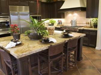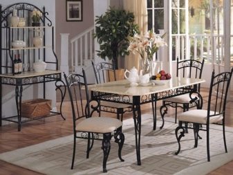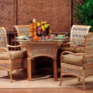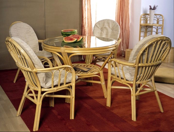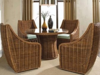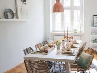 أثاث الخوص خفيف الوزن للغاية ومناسب للغرف الفسيحة. من الضروري وضع الزجاج أعلى طاولة الخوص ، مما يحمي المادة من التلوث. بالنسبة للكراسي والأرائك المصنوعة من الخيزران ، ستحتاج إلى مقاعد ناعمة خاصة أو وسائد صغيرة عادية. الحل الأصلي إلى حد ما هو أثاث مزور. من المرجح أن تكون هذه الكراسي والطاولة مناسبة في المناطق الداخلية من الضواحي أكثر من المباني السكنية. يمكن أن تكون عناصر أثاث المطبخ مصنوعة من مواد مختلفة ، الشيء الرئيسي هو أنها تتناسب مع المفهوم العام.