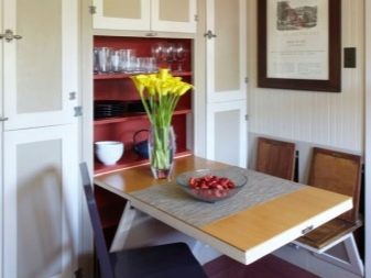 بالنسبة للمطابخ الصغيرة ، طور المصممون أثاثًا خاصًا – محول. نظرًا لهذا النوع من التصميم ، لا يمكنك توفير المساحة فحسب ، بل يمكنك أيضًا استخدامها بطريقة عقلانية للغاية. اخلق مساحة دافئة ومتناغمة. الطاولات القابلة للطي التي تتحول إلى رف وكراسي قابلة للطي لن تشغل مساحة كبيرة في مطبخ صغير.
