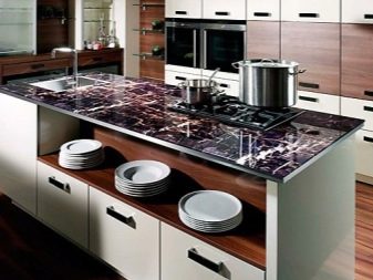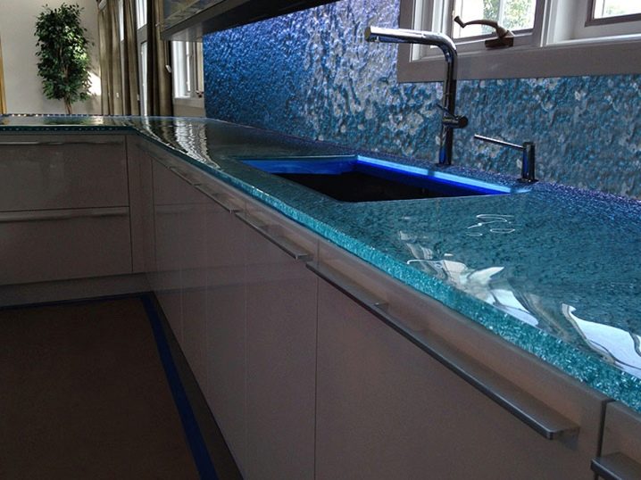 غالبًا ما يتم تغطية سطح العمل أيضًا بزجاج سميك للحفاظ على مظهره لفترة أطول. الزجاج مادة لا تفرط بصريًا في مساحة المطبخ.. يمكن أن يكون الزجاج شفافًا أو بلوريًا أو بنمط مطبق عليه. يجدر اختيار أرجل معدنية لمثل هذا المنضدة. تتناسب هذه المواد تمامًا مع التصميم الداخلي بأسلوب التبسيط أو التكنولوجيا الفائقة. عيب هذه المادة لطاولة المطبخ هو تلوثها المفرط ؛ يجب مراقبة سطح الطاولة هذا بعناية أكبر.