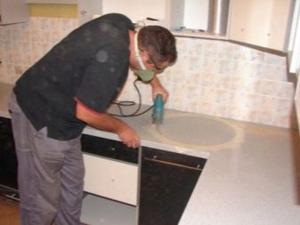 ثم يتم قطع فتحة في سطح العمل للحوض ويتم تثبيت سطح العمل. إذا كان نموذج المطبخ زاويًا ، فمن الضروري توصيل الأطراف بشرائط معدنية خاصة. في غرفة صغيرة ، المطبخ بسيط ويوضع في شريط واحد.. تغطي القاعدة الخاصة الفتحة بين سطح العمل والجدار. قم بتركيب الحوض والموقد والغطاء.