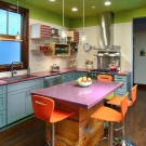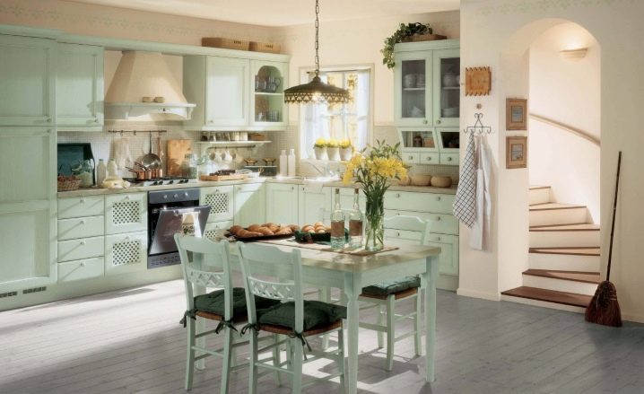 المطابخ الملونة نادرة جدا. يستخدم المصممون بشكل أساسي ظلال هادئة طبيعية فقط. على سبيل المثال ، الأخضر والأحمر والأصفر والأزرق.