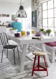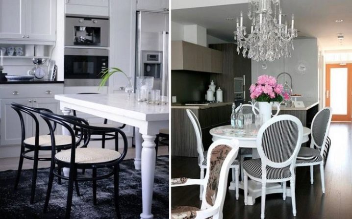 قد يبدو أن مثل هذا الحل يجلب التنافر إلى داخل المطبخ ، لكن هذا بعيد كل البعد عن الواقع. الكراسي هي الوتر النهائي المستقل في تصميم المطبخ ، ويعتمد الجو العام للمطبخ ككل على مدى أصالتها..
