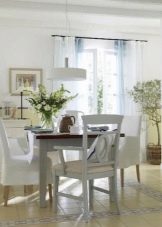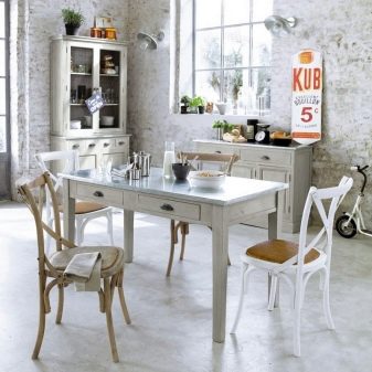 يتطلب المطبخ المصمم على طراز بروفانس أثاثًا عمليًا. على سبيل المثال ، الكراسي الصلبة المصنوعة من أرجل منحوتة بدون وسائد ناعمة مناسبة. إنها تنقل تمامًا جو “بروفانس” المكرر ، ولا تشوش الغرفة.