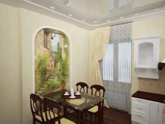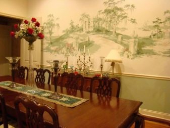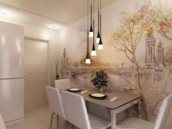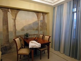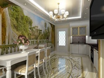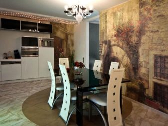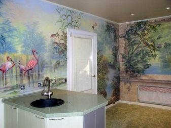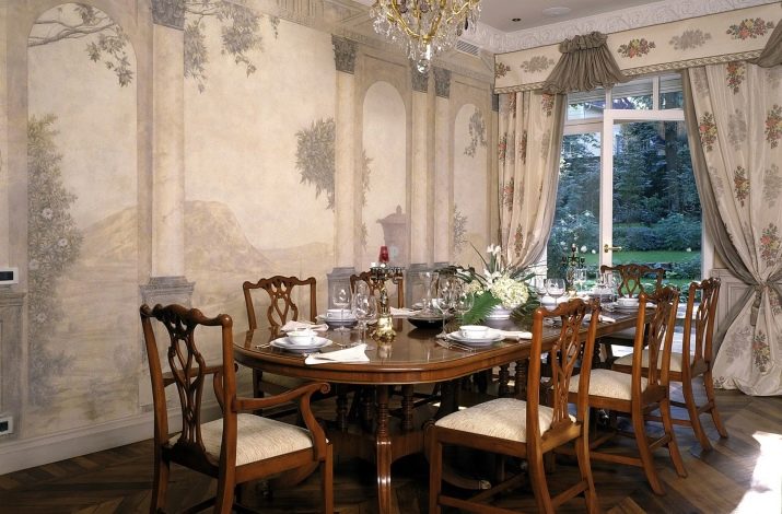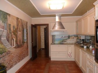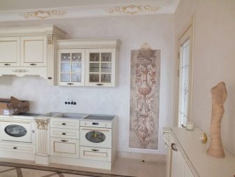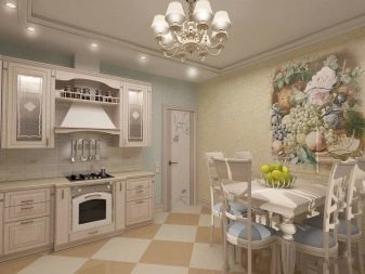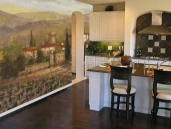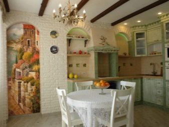 ستبدو اللوحات الجدارية ذات الحياة الثابتة وصور الشخصيات الأسطورية والمخلوقات والمناظر الطبيعية وما إلى ذلك مثيرة للاهتمام في المطبخ. بالاقتران مع الجص المزخرف ، ستحصل على جو لا يمكن تصوره من الفخامة والأناقة.