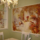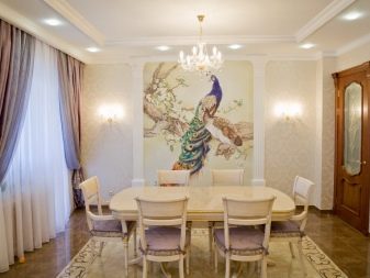 يبقى المكان الرئيسي لربط مثل هذه اللوحة القماشية جدارًا مجانيًا ، حيث سيتم تركيز الانتباه في الداخل. يلجأ الكثيرون إلى خيار تأطير اللحامات الجانبية بجص الجص ، الرغيف الفرنسي الجميل ، القوالب. وهكذا ، يتم الحصول على صورة جميلة ، محاطة بإطار أنيق. يوصي المصممون بتثبيت اللوحة الجدارية على ثلث الجدار. سيصبح التصميم فريدًا إذا لم تضع الرسم في الوسط ، ولكن في أجزاء منفصلة من الحائط..