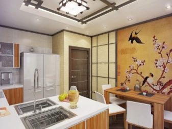 في هذا الوقت ، النمط العرقي مليء بالرسومات الملونة. يمكنك عرض أجواء أي بلد في مطبخك الخاص. هل تحب أن تدلل نفسك من وقت لآخر بأطباق محلية لذيذة؟ قم بإضفاء الإثارة على التصميم الداخلي الخاص بك مع الزخارف الصينية واليابانية والخيزران والساكورا والرافعات والمناظر الطبيعية للسافانا والكتابة الهيروغليفية والأهرامات والتماثيل والمزيد..