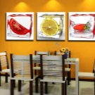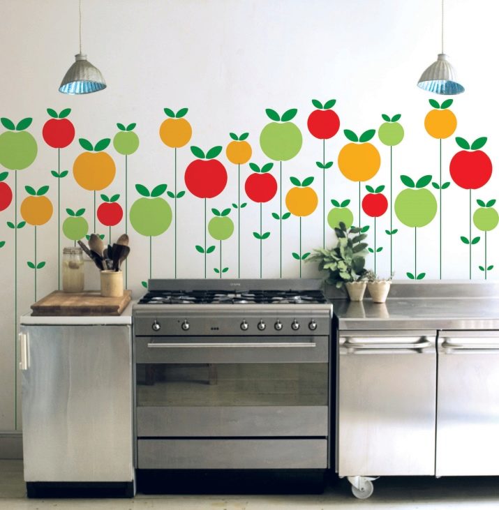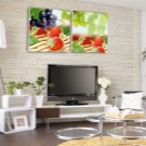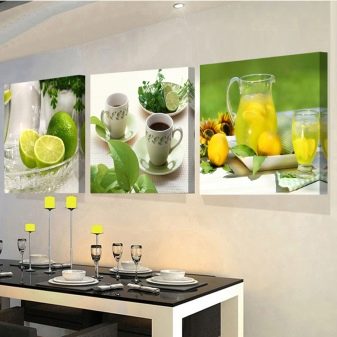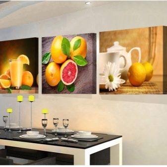 مهما كانت الصورة ، فهي ، أولاً وقبل كل شيء ، مطابقة لمجموعة مطبخ حقيقية ، لأن كل شيء يجب أن يكون متناغمًا في اللون والموضوع. لذلك ، بالنسبة للمطبخ بألوان صفراء أو برتقالية أو خضراء أو صلاد للواجهات ، فإن اللوحات التي تصور التفاح والبرتقال والليمون والفواكه الأخرى ذات الأصل الغريب مناسبة..