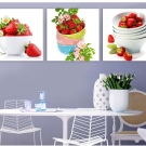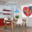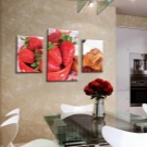 إذا كان الجزء الداخلي مصنوعًا من ظلال أكثر هدوءًا ، فمن الأفضل اختيار سمة التوت مثل الفراولة أو التوت أو الكرز أو التوت. يمكن أن تزين هذه اللوحات المطبخ بشكل مفيد بأثاث حليبي أو بيج..