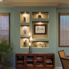 يتضح أن التصميم جميل بشكل خاص إذا كان مزينًا بعناصر زخرفية. خلفية مع صور الطبيعة مثالية. يمكنك استخدام المواد الطبيعية الطبيعية – فروع الأشجار المجهزة والمطلية ، والزجاج الشفاف أو الملون ، والحجر. يمكنك إنشاء “نادي” تقليد من خلال صنع مكان مخصص لاستيعاب المشروبات المختلفة. في مثل هذه الحالات ، يعتبر الجص والعناصر الزجاجية والأبواب مثالية..