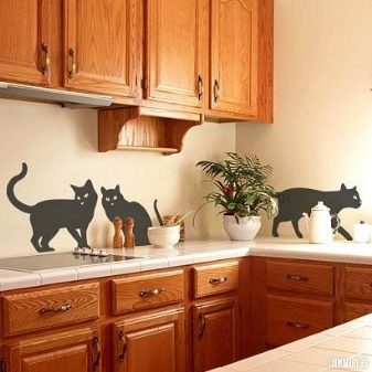 القطط. موضوع “أبدي” آخر. أولاً ، القطط هي أكثر الحيوانات الأليفة المحبوب وهم الذين لا يغادرون المطبخ في كثير من الأحيان. ثانيًا ، تبدو الصور الظلية للقطط المنحنية والرائعة أنيقة وروح الدعابة. على ملصقات المطبخ ، يمكن للقطط اصطياد الفئران أو صيد الأسماك أو “سرقة” الطعام من الثلاجة أو ببساطة “الجلوس” حولها أثناء انتظار الغداء: