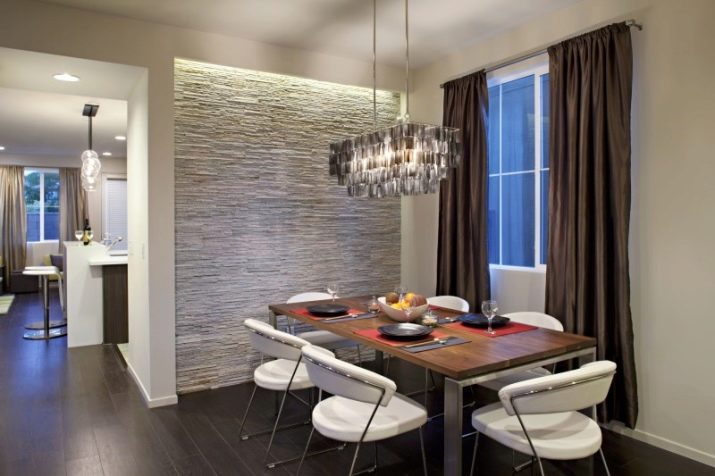 ينصح المصممون بإنشاء جدار حجري واحد فقط في المطبخ ، والذي سيصبح أهم ما يميز تصميم هذه الغرفة. بالإضافة إلى ذلك ، يوصي الخبراء بإعطاء الأفضلية للبناء الأفقي ، حيث سيساعد ذلك في جعل غرفة المطبخ أوسع بصريًا وأكثر حرية. من أجل توفير الراحة لمنطقة تناول الطعام ، يكفي تقليمها جزئيًا على الأقل بحجر من الألوان الدافئة. سيكون حل التصميم هذا موضع تقدير من قبل ضيوفك بالتأكيد ، وسيساعد في جعل المطبخ غير عادي وفريد من نوعه بطريقته الخاصة..