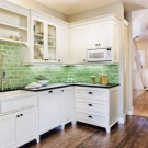 لمزيج من ثلاثة ألوان مناسبة للبلاط على شكل مربعات صغيرة أو مستطيلات ضيقة. يبدو المريلة متناغمة ، حيث يتم دمج البلاط: