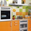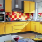 لإنشاء ساحة ساطعة ومتناقضة ، يكون مزيجًا من لونين مناسبًا ؛ للظلال الأكثر نعومة والباستيل ، يمكنك اختيار 3-4 أنواع. أي مجموعة ألوان مناسبة للمطبخ ، والتي سترتبط بالطعام اللذيذ والشهية. على سبيل المثال ، البلاط البرتقالي والليمون والزيتون والبورجوندي والأرجواني والأخضر.