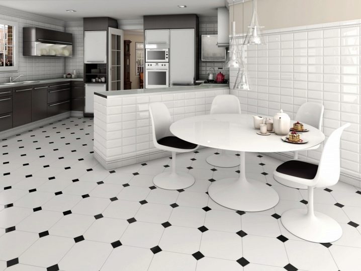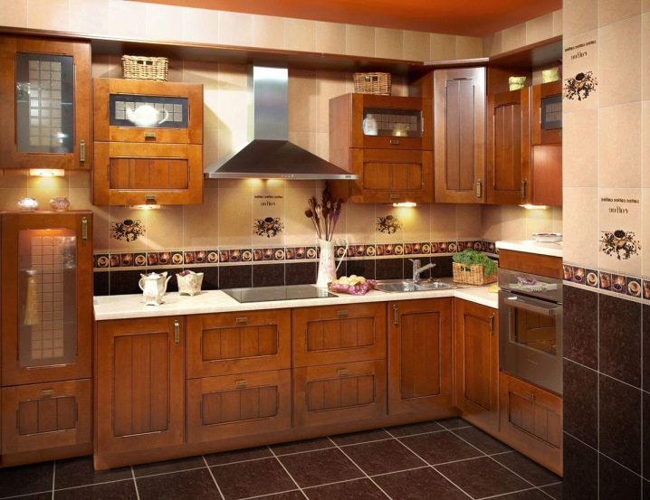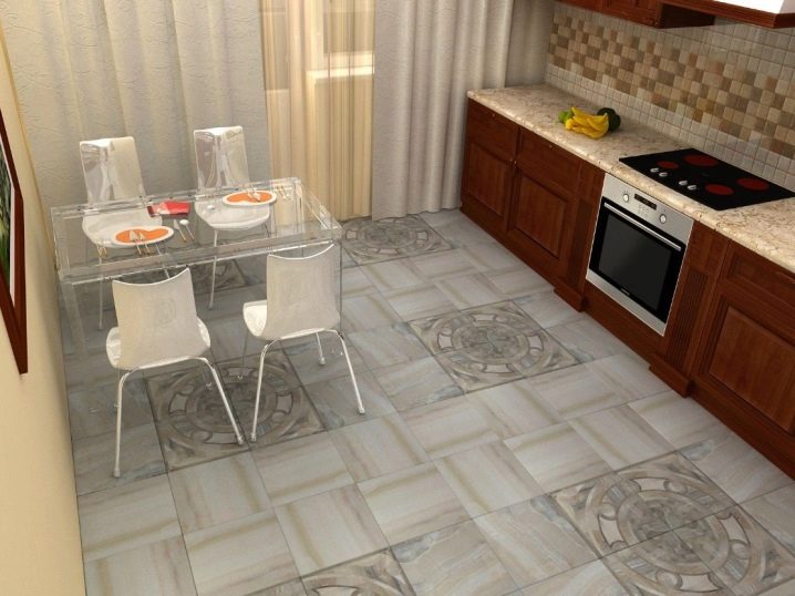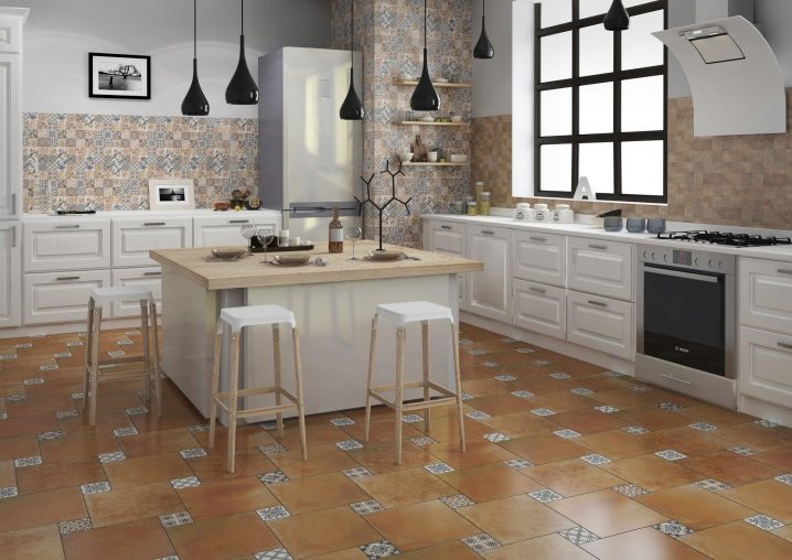 إلى جانب التطبيق العملي ، يجب أن يكون بلاط الأرضيات أنيقًا ومتطورًا وجميلًا. عادة ما يكون مشابهًا في اللون والملمس للمئزر ، ولكنه أقوى وأكبر في الحجم.. أو يمكن أن تعمل كوحدة مستقلة من الداخل. في هذه الحالة ، يوجد نوع من النقش ، أو زخرفة نباتية على البلاط ، أو بفضل لعبة الظلال أو الألوان المختلفة ، يتم وضع نمط كامل. سيتناسب هذا الخيار مع المطبخ بأسلوب بروفانس أو على الطراز الريفي..