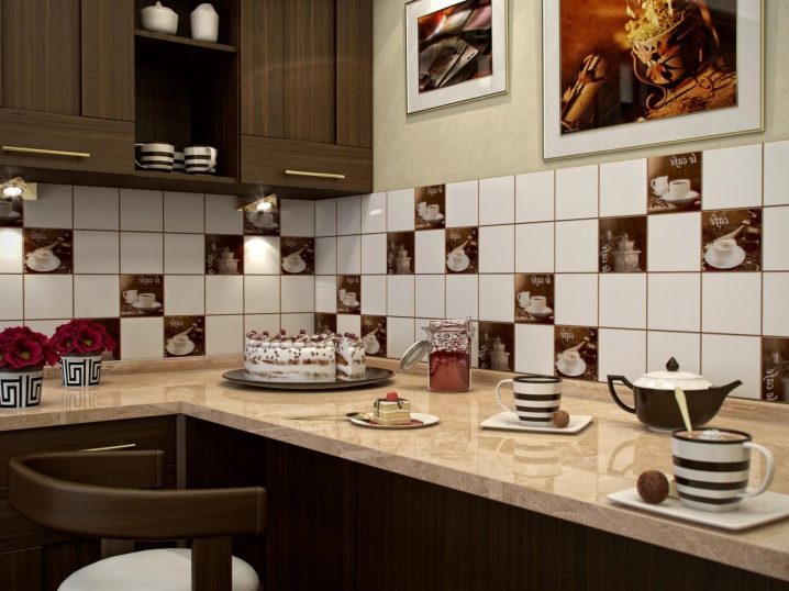 بالنسبة لمئزر بني أو بيج عادي ، فإن إدراج السيراميك مع صورة فنجان أو حبوب قهوة أو نمط من تجعيد الشعر الذهبي المعقد مناسب. تكمن خصوصية اللون البيج في أنه قادر على تظليل مجموعة مطبخ بيضاء ، وإنشاء مجموعة واحدة مع اللون الطبيعي للخزائن الخشبية ، وتنعيم الظل شديد السطوع واللمع للواجهات اللامعة..