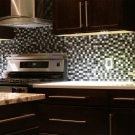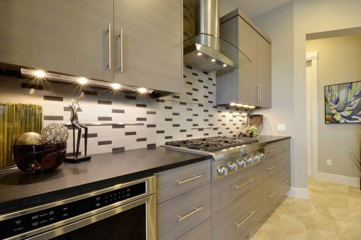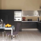 - أسلوب التكنولوجيا الفائقة. إنه اتجاه تصميم حديث إلى حد ما ، تهيمن عليه الألوان الداكنة ، لذا فهو مثالي للمطبخ الداكن ، ويفاجئ الآخرين بالبلاط المزخرف الفاخر..