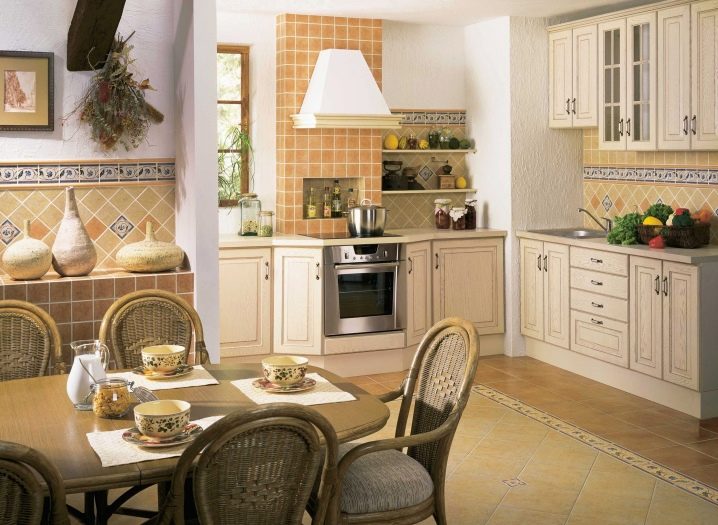 - أسلوب بروفانس. تم تزيين المطبخ المصمم على طراز بروفانس بظلال الباستيل ، والتي يمكن أن تكون ألوانها من البلاط البيج والوردي والأبيض والنعناع والأزرق..