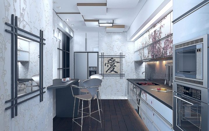 في اليابان ، لا تفضل الألوان الداكنة في المناطق الداخلية. لصالح الزيتون والقهوة والحليب. ألوان الكراميل. للتشطيب ، يجب أن تعطي الأفضلية للبلاط بهذه الألوان. يستخدم الأسود على النقيض من التصميمات الداخلية اليابانية. على عكس البلاط الفاتح ، يمكنك اختيار ورق الحائط بالهيروغليفية والستائر أو الستائر لتتناسب مع ورق الحائط.