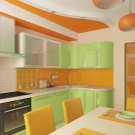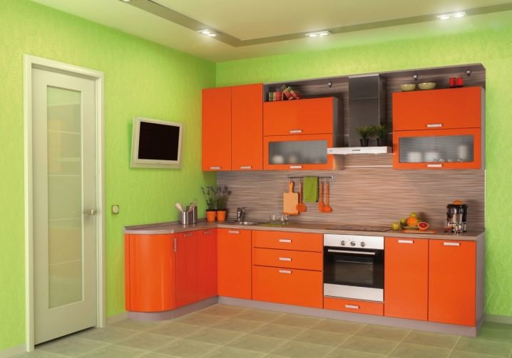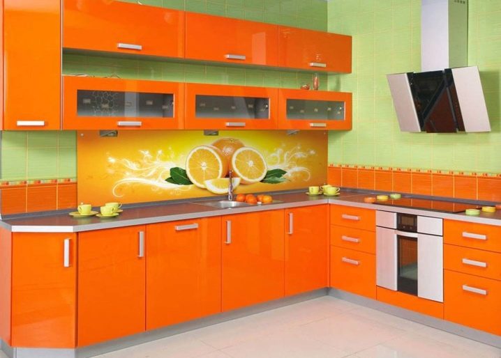 خلفية خضراء من الأفضل اختيار ظلال هادئة – الزيتون والنعناع والفستق. يتم دمج اللوحة البرتقالية بأكملها عضويًا مع اللون الأخضر. سيتم استكمال تصميم مثل هذا المطبخ برسومات نباتية أو طباعة غير عادية..