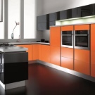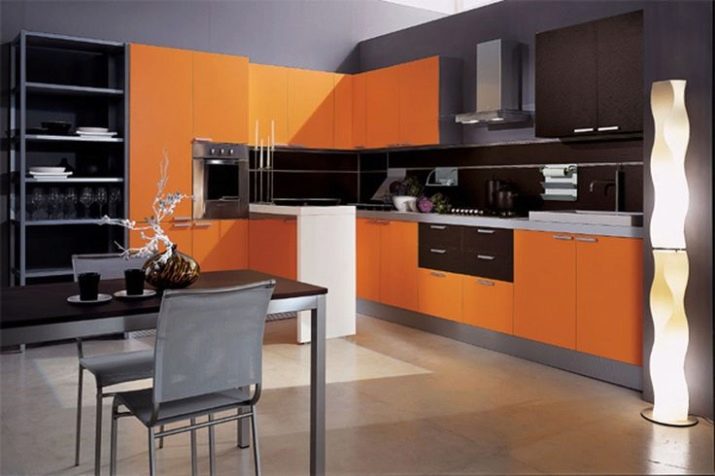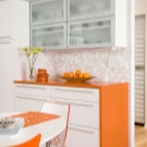 للأبيض من الأفضل اختيار الظل الدافئ للبرتقال. ستعمل خلفية الحليب على تنعيم الجزء الداخلي من المطبخ البرتقالي. يجب على عشاق العصر الحديث إلقاء نظرة فاحصة على اللون الرمادي ، مما يجعل المطبخ حديثًا وعصريًا. في نظام الألوان هذا ، سيصبح المطبخ أكثر راحة. يجب استخدام اللون الأسود بحذر وبكميات صغيرة بالتفصيل.