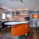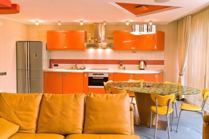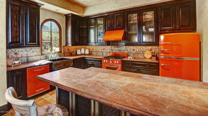 بالنسبة إلى كونترتوب لامع أو طاولة عاكسة ، يعد النمط البرتقالي خيارًا رائعًا. سيصبح المطبخ خفيفًا وجيد التهوية ودافئًا ومريحًا. هذا المزيج مناسب للبساطة أو التكنولوجيا الفائقة..
