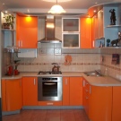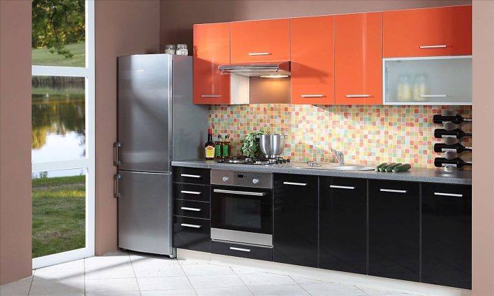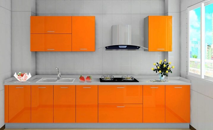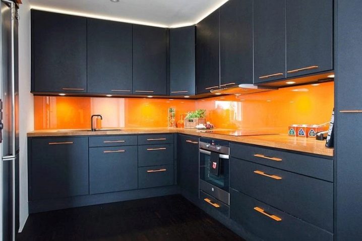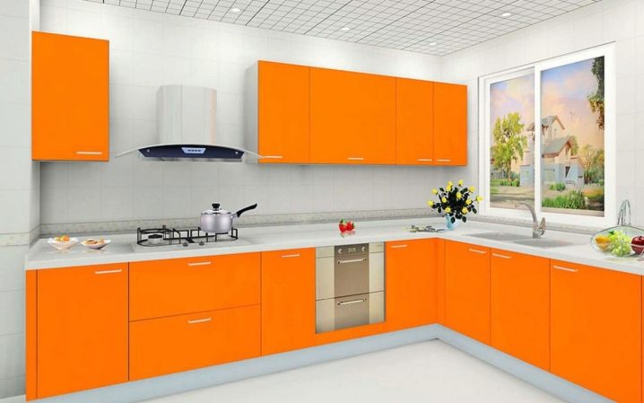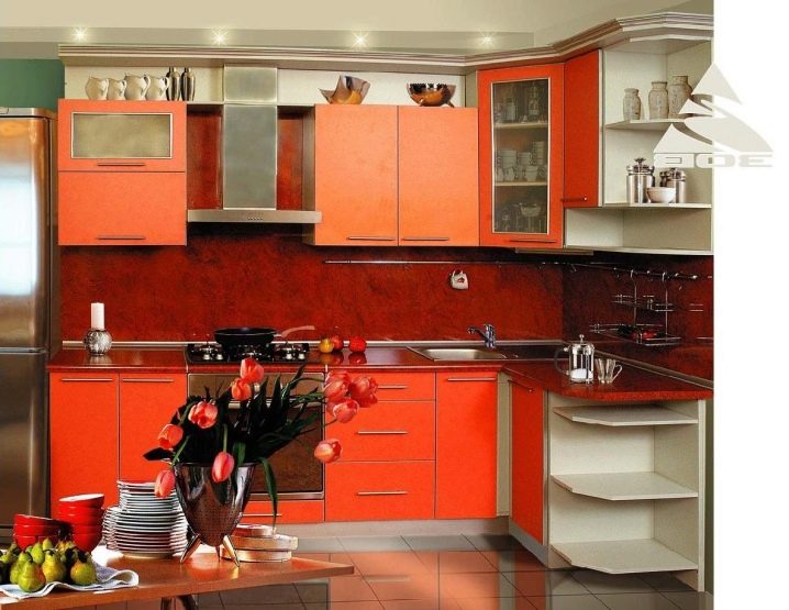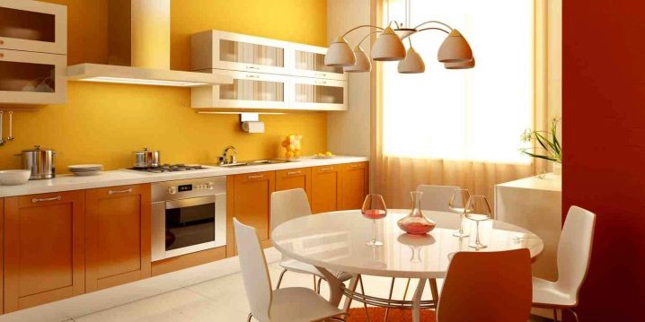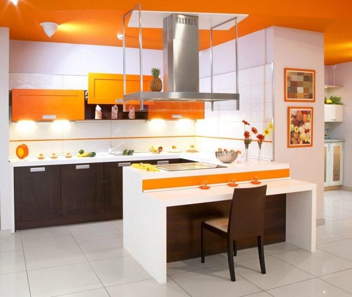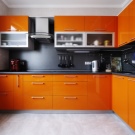 عند تطوير التصميم ، يجدر النظر في حقيقة أن اللون البرتقالي يلفت الانتباه إلى نفسه.. يذكر هذا الظل بصيف دافئ والاسترخاء والإهمال ، لذا فهو مثالي للمطبخ في الجزء الشمالي من المنزل. سوف يساعدك البرتقالي في إبقائك دافئًا. يمكن للوحة برتقالية أخرى ضبط مساحة المطبخ وشكله. ستصبح الغرفة المطولة أوسع.