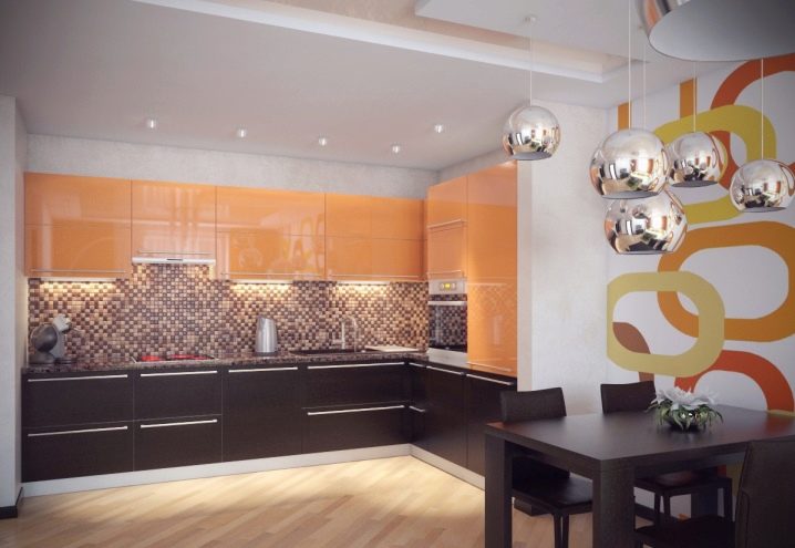 خزائن الحائط البرتقالية مثالية لأثاث المطبخ البني. يمكنك استخدام ورق حائط أبيض مع طباعة هندسية كبيرة. والنتيجة هي أسلوب يشير إلى المستقبل. يمكن لصق ورق الحائط المصنوع من الطين البني المهيكل أو البلاط المربع الصغير فوق سطح العمل.