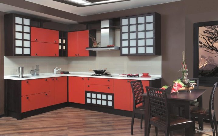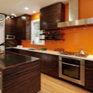 يبدو المطبخ المصمم على الطراز الياباني مقتضبًا للغاية وغير عادي. ورق حائط عادي بني داكن مناسب لمجموعة المطبخ البرتقالي. يمكن تنويع الأجزاء الداخلية بإدخالات بيضاء فوق سطح الطاولة. يمكن أن يجمع الأثاث أيضًا بين اللون البرتقالي والبني والأبيض. اللوحة مع الخيزران أو ساكورا ستكمل بشكل متناغم الداخل.