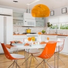 كراسي بار شفافة ومساحات خضراء وزهور في عبوات زجاجية مستطيلة. سقف أبيض تمامًا ، يمكن جعل الجدران أغمق. مصابيح مطولة في تصميم معدني. جناح برتقالي وسطح طاولة أبيض صلب. هذه هي الطريقة التي تصنع بها المطبخ العصري المثالي..