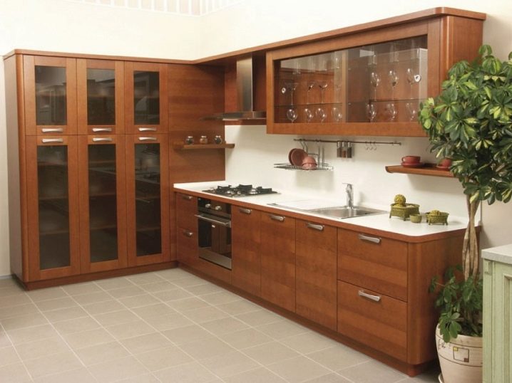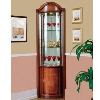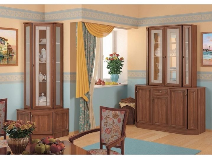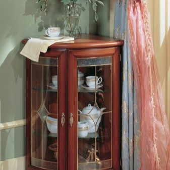 خزانة الزاوية ، بسبب أصالتها ، تصبح زخرفة أنيقة للمطبخ. يتم تثبيته عادة في غرفة الطعام في المطبخ ، أو في غرفة المعيشة في المطبخ. تبدو خزانة الملابس ذات الزاوية الطويلة جميلة بشكل خاص ، والتي تتناسب مع طراز بقية الأثاث. في مثل هذه الخزانة ، يمكنك وضع جميع الأطباق المتاحة..