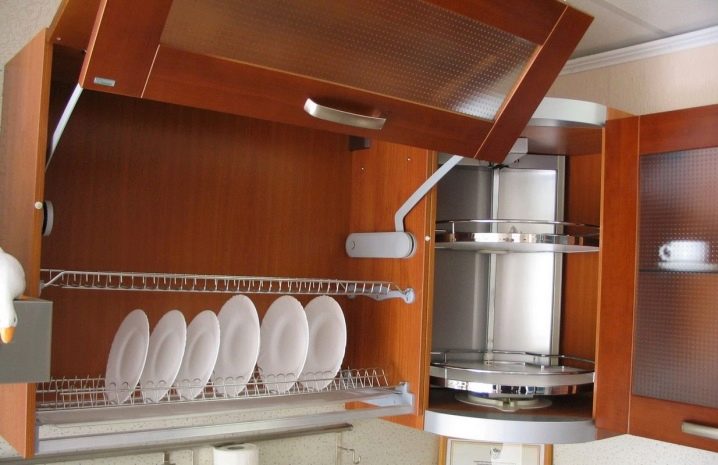هذا الخيار صغير الحجم نسبيًا ، لذا فهو يناسب مساحة المطبخ الصغيرة. ستناسب خزانة المطبخ الصغيرة المثبتة على الحائط مجموعة قياسية من الأطباق لثلاثة أو أربعة أشخاص. للحفاظ على سلامة الأطباق الهشة ، تم تجهيز الطرز المركبة بحوامل معدنية خاصة.