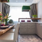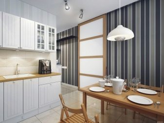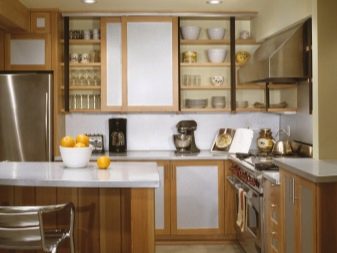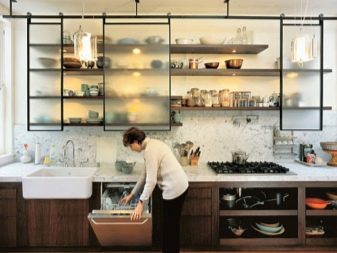 - تحظى الأبواب المنزلقة بتقدير خاص من قبل أصحاب المطابخ الصغيرة.. هناك أوقات عندما تكون هناك حاجة لخزائن المطبخ المفتوحة باستمرار ، بينما لا توجد مساحة إضافية. في هذه الحالة ، يتم حل المشكلة عن طريق تثبيت الأبواب على الأدلة. تفتح من المركز إلى جوانب الخزانات.