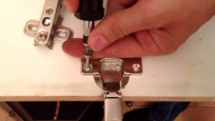 - استبدال مفصلات الخزانة بنفس السهولة. من الضروري إزالة الجهاز القديم وتركيب جهاز جديد في نفس الأماكن ، مع قياس ما إذا كانت المفصلات الجديدة مناسبة أم لا ، حيث لا يمكن أن تكون جميع العناصر بنفس الحجم. هذا يكمل التجميع. يتم تثبيت المفصلات بمسامير. يتم محاذاة المفصلة أثناء تثبيت الوشاح.