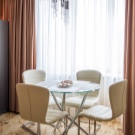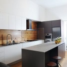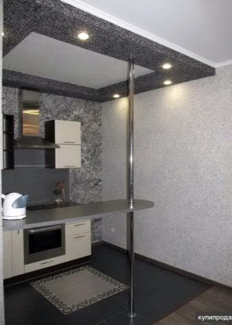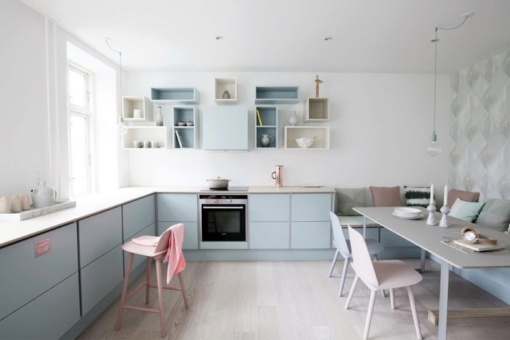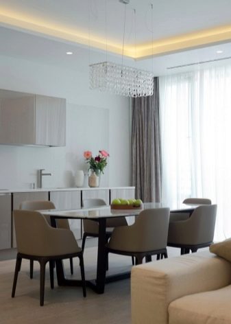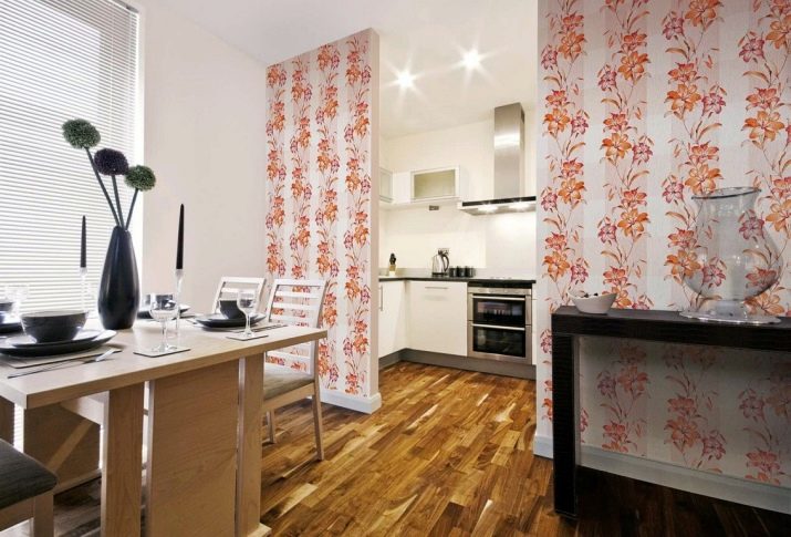 في الغرف الصغيرة التي تجمع بين عدة وظائف في وقت واحد ، فإن تقسيم المناطق باستخدام ورق الحائط أو الأثاث هو عمليًا الخيار الوحيد لإنشاء مساحة متناغمة. نظرًا لأن المطبخ غالبًا ما يجمع بين منطقة الطهي ومنطقة لتناول الطعام. يمكنك تقسيمهم على النحو التالي: