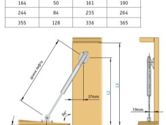 يوضح الشكل تمثيلًا تخطيطيًا للتثبيت وجدولًا لمراسلات أبعاد التثبيت. يوضح هذا تثبيت الآلية عند تأرجح الباب لأسفل. يتم تثبيت باب الرفع بنفس الطريقة تمامًا. بادئ ذي بدء ، يتم التحقق من امتثال المعدات المحددة: بالنسبة لخزانة الحائط بارتفاع تجويف داخلي يبلغ 365 مم ، يلزم رفع الغاز بحجم 355 مم.