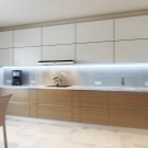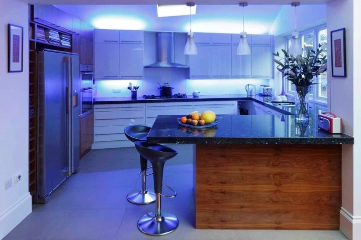 - مصابيح فلورسنت. غالبًا ما يتم استخدامها كجهاز إضاءة قائم بذاته وتقع أسفل الخزانات العلوية. الضوء ، أبيض ، قوي بدرجة كافية.