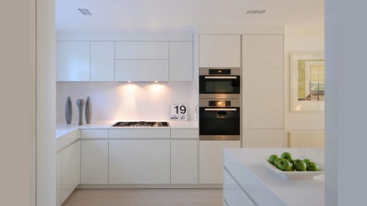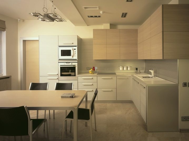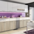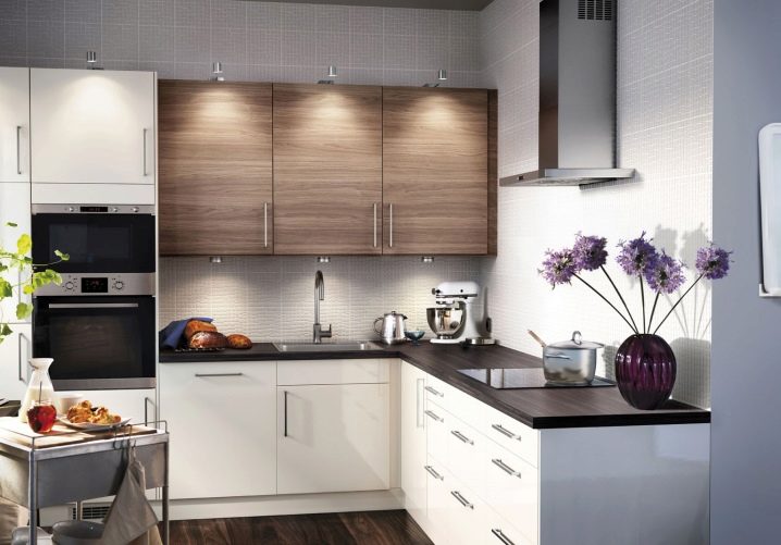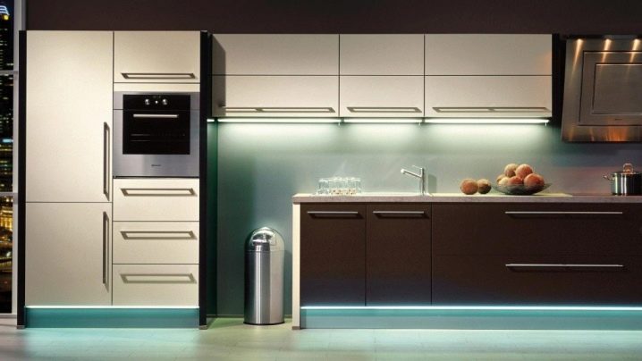 تعد إضاءة منطقة العمل شرطًا أساسيًا لجميع المطابخ ، بغض النظر عن مدى الإضاءة التي قد تبدو عليها. لكي لا تبدو مجموعة المطبخ مرهقة بصريًا ، يمكن وضع أرفف صغيرة مفتوحة في أسفل الخزانات ، ولخلق جو من الراحة ، يمكنك أيضًا تجهيز الإضاءة الزخرفية. يمكن أن تكون مصابيح سقف أو مصابيح مدمجة في حاجب المطبخ ، أو يمكن أن تكون شريط LED يمتد إلى أسفل..