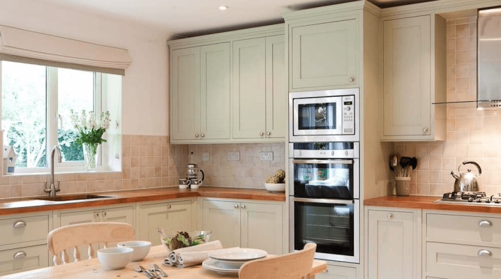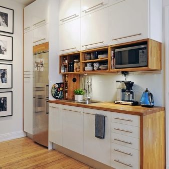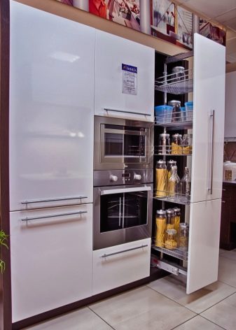 ينصح الخبراء بشراء تركيبات معيارية كنظم تخزين. واسعة ، لا يمكنهم وضع أدوات المطبخ الضرورية فحسب ، بل يمكنهم أيضًا استخدام سطح الخزانة كقاعدة لسطح العمل.