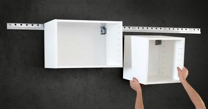 يتم تعليق جميع أنواع الخزائن وفقًا لهذا المبدأ. بعد تعليق جميع العناصر الموجودة في سماعة الرأس ، يمكنك توصيلها معًا باستخدام برغي أثاث. في المرحلة الأخيرة ، يتم تثبيت الأفاريز والأرفف والأبواب..