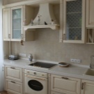 لكن الحجر الطبيعي مادة باهظة الثمن إلى حد ما. لذلك ، لا يستطيع الجميع تحمل مثل هذا المطبخ. يمكنك استبداله بتقليد جيد للحجر الطبيعي المصنوع من بلاط السيراميك البسيط..