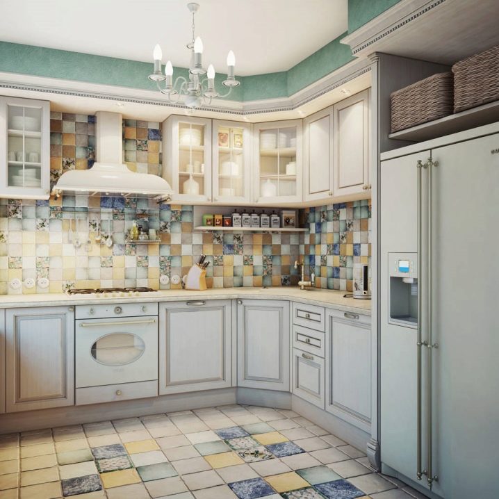 أسهل طريقة لوضع بلاط السيراميك هي إنشاء أنماط فسيفساء. اليوم ، الصور بأسلوب الترقيع شائعة. يشبه هذا القماش بطانية ملونة مخيط من قصاصات صغيرة من القماش. في مطبخ على طراز بروفانس ، سيبدو مثل هذا المريلة جيدًا جدًا. يمكن أن تكون المربعات التي تشكل اللوحة القماشية نتيجة لذلك مختلفة تمامًا: أحادية اللون أو منقوشة أو أجزاء من الصورة بأكملها ، ممزقة من الصورة العامة..