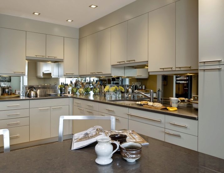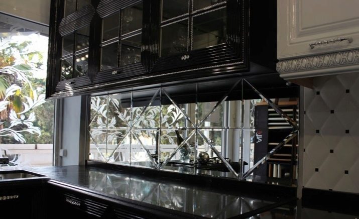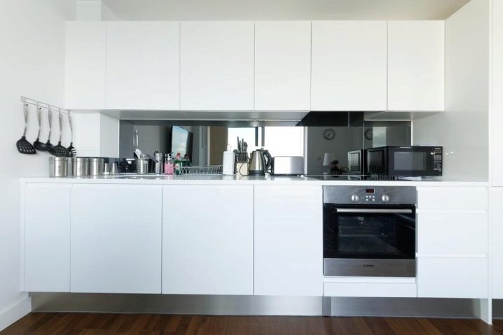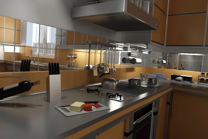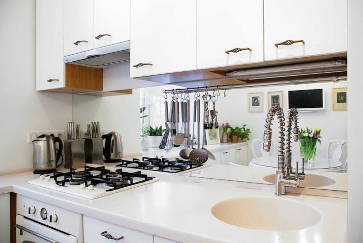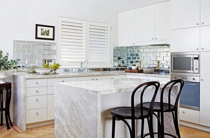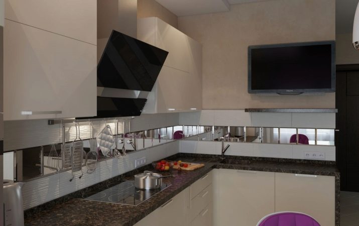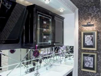 يجب أن يؤخذ في الاعتبار أن المريلة في المطبخ تشغل مساحة صغيرة نسبيًا بين الخزانات العلوية والسفلية ومنطقة العمل ، بفضل السطح المرآة ، تبدو وكأنها وحدة واحدة. لا تضع المرايا على البلاط فقط أو فوق الحوض مباشرة ، لأن ذلك سيقطع المساحة..