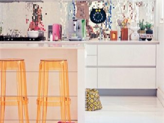 هذا النوع من المرايا يناسب بشكل جيد للغاية داخل المطبخ الكبير. تسحق عناصر الفسيفساء المساحة ولا تخلق إحساسًا ببنية شاملة. ساحة الفسيفساء من أصغر العناصر ذات الأشكال المختلفة تبدو جميلة ومثيرة للإعجاب. يستخدم المصممون هذا الخيار بنشاط عند إنشاء مطبخ داخلي بأسلوب عالي التقنية وحديث..