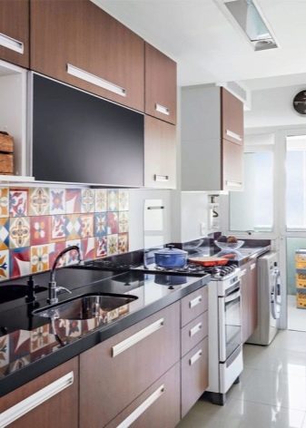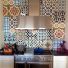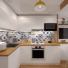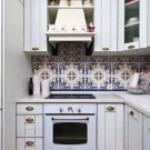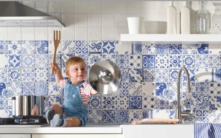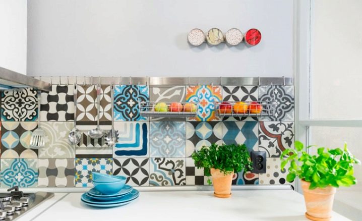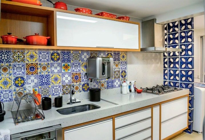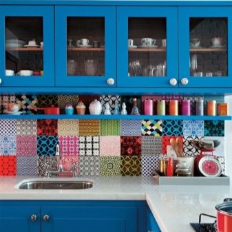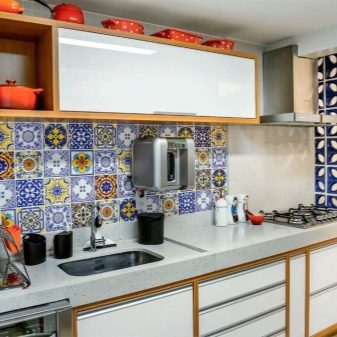 يبدو لون المغرة والأزرق والنيلي مكررًا ونبيلًا. يمكنك راحة المطبخ بمساعدة موقد سيراميك مزين بموضوعات رعوية وصور التوت والفواكه على خلفية بيضاء. باستخدام تقنية الترقيع ، يمكنك تكوين لوحة أصلية فوق موقد أو مغسلة ، والجمع بين البلاط ذي الاتجاهين والأنماط. عند مواجهة ساحة المطبخ ، ينصح الخبراء باستخدام أفاريز من نفس المجموعة مثل البلاط نفسه. لا يجب أن تتناوب الدرجات اللونية الساطعة مع المطبوعات المتنوعة والمشرقة ، مما يهيئ الحالة المزاجية للغرفة بأكملها.