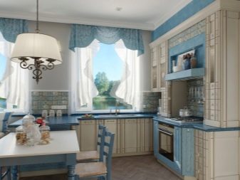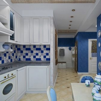 يوفر الديكور الساحر ظلال من اللون الرمادي والأزرق واللؤلؤ. إذا كان المطبخ يحتوي على مخرج إلى الشرفة ، فيجب أيضًا تزيينه بأسلوب خليط. الرسم في الزخارف الزهرية والرسومات والخيال مناسب.