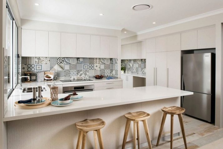 توجد مستويات متوسطة يجب أن يبدأ عندها المريلة (85 سم من الأرضية وحتى ارتفاع 70 سم). من المهم عدم ترك مساحة إضافية تحدد بصريًا منطقة متعددة الألوان بها ثلاجة ، ونافذة ، وطاولة بار ، وما إلى ذلك. إذا كنت تريد توفير ميزانيتك ، فاخذ بلاطًا أو بلاطًا مع إمكانية وضعه في أي طائرة..