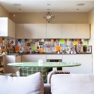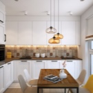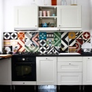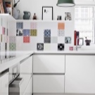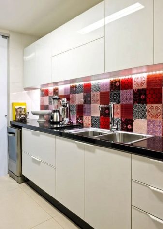 إذا كنت تحب المطبخ الأبيض ، فيمكنك في أي وقت “ارتداء الملابس” في مثل هذه الفسيفساء البسيطة. ابتكر تصميمًا مخصصًا للبلاش الخلفي أو الأرضيات لإضفاء لمسة جيدة على الديكور الداخلي الخاص بك. من المزايا المهمة لطريقة التصميم هذه إمكانية التجميع الذاتي لتكوين التصميم. يمكنك التقاط وحدات ملونة (مربعات) من مجموعات مختلفة. في هذه الحالة ، يجدر الالتزام بنظام الألوان العام ، واللعب على التناقضات.