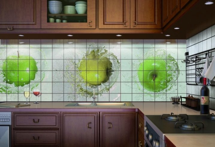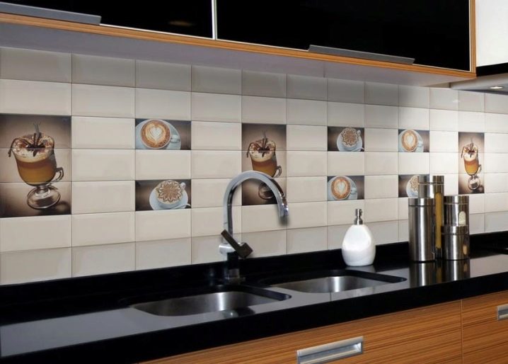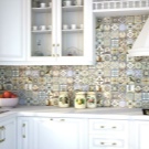 غالبًا ما يتم استخدام البلاط أيضًا لإنشاء ما يسمى بالمآزر. حتى لو كانت جميع الجدران في المطبخ مزينة بورق حائط ، فإن ساحة مصنوعة من بلاط السيراميك ستكمل المساحة بشكل جيد ، الشيء الرئيسي هنا هو اختيار الألوان والأنماط المناسبة.